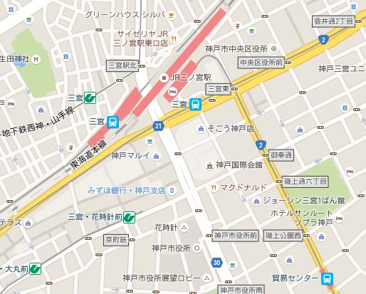 JR三ノ宮駅の東口の前にあり、阪神本線の神戸三宮駅からだとA18階段から進む事になるので遠くなる。